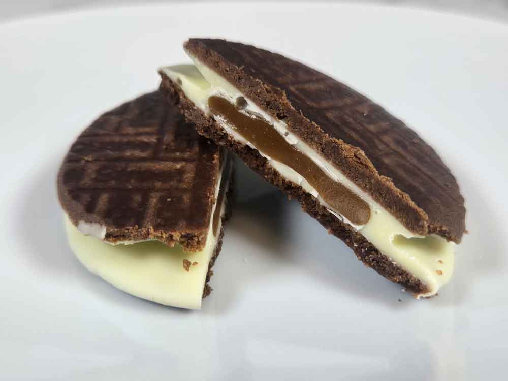 ビターなカカオクッキーにホワイトチョコレートをコーティングし、中には香ばしいヘーゼルナッツキャラメルがとろり。
