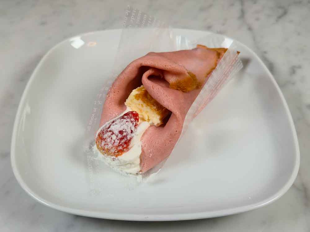 セブンイレブン新発売「もちもち生地のいちごチョコクレープ」を実食レビュー。いちごソース・ミルククリーム・チョコの絶妙なバランスと、パイ生地の楽しい食感が魅力。甘酸っぱくて幸せになれるもちもちクレープです。