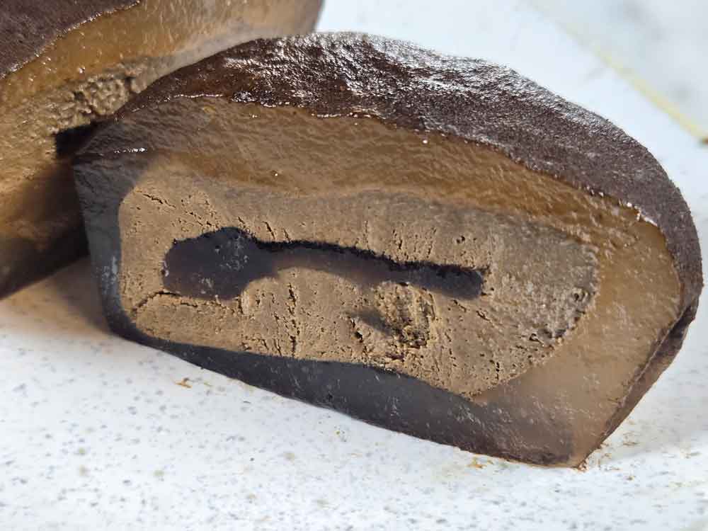 外はプニプニ、中はなめらかクリーム+とろっとした層。